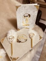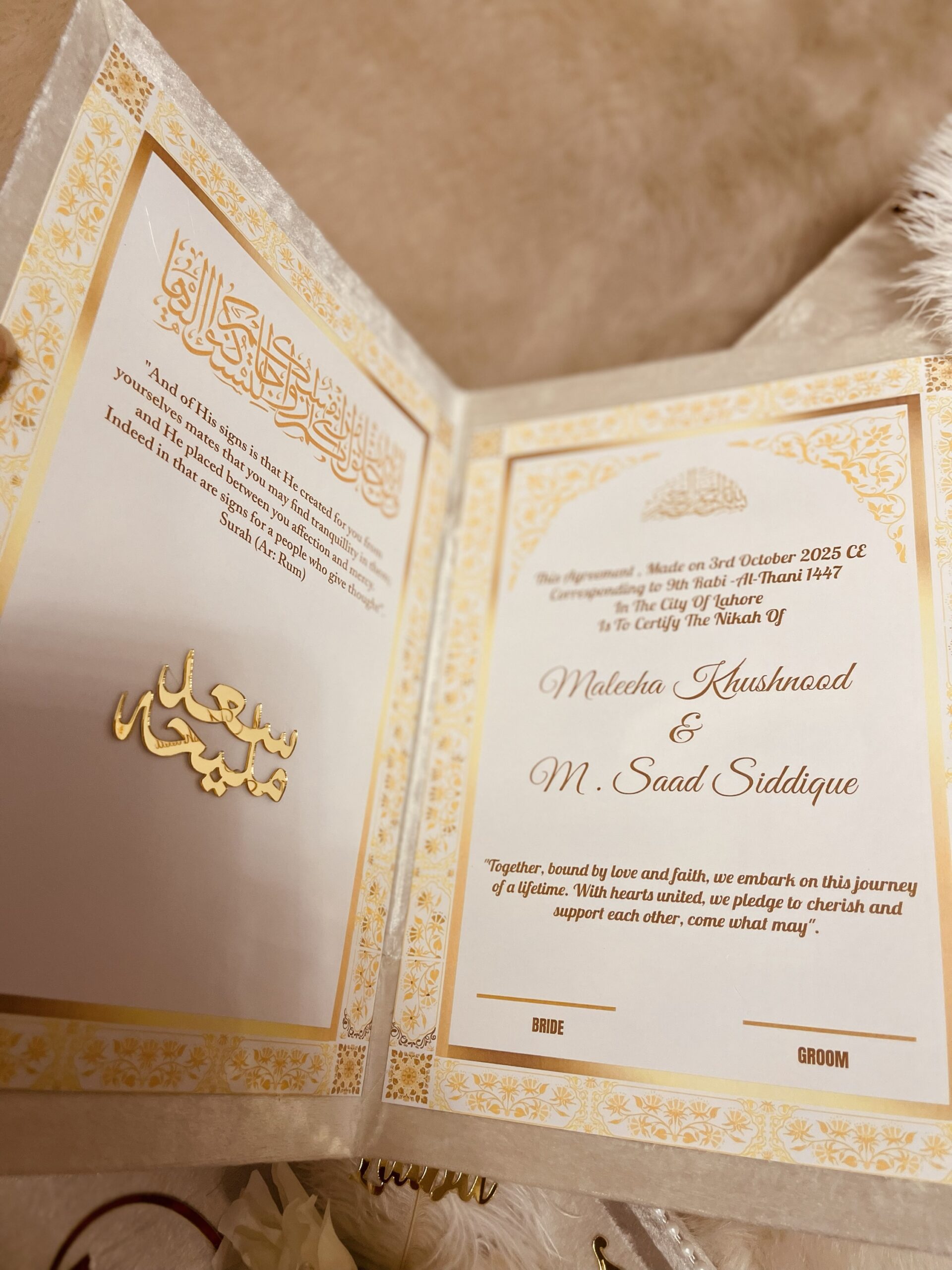 A Nikah nama booklet with a box is an elegant, personalized keepsake and display piece for the Islamic marriage contract, often featuring decorative designs, calligraphy, and space for signatures or thumbprints, and presented in a special case or box rather than serving as the official, legal marriage certificate. These ornamental booklets are not the formal Nikkah Nama document but are designed to honor the sanctity of the wedding and serve as a cherished memento for the couple.