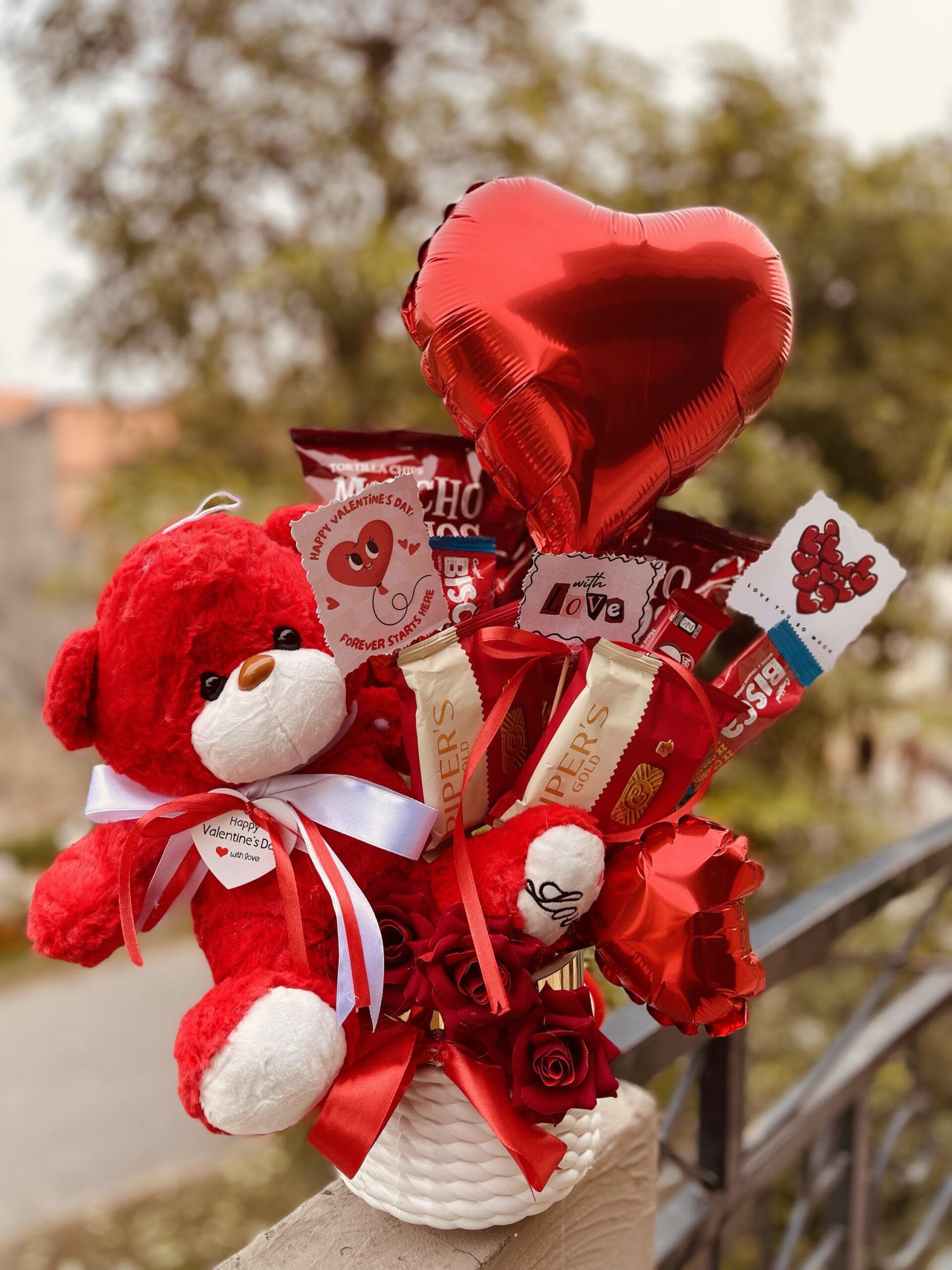 Includes: A medium sized teddy bear 4 mix chocolates 2 machos tortilla chips 2 pipers gold cookies 1 x Wishes